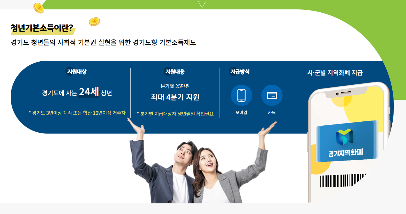 경기도 청년기본소득은 경기도에 거주하는 청년들의 사회적 기본권 보장과 경제적 지원을 위한 정책입니다. 분기별로 25만 원씩 최대 4분기(총 100만 원)를 지급합니다.